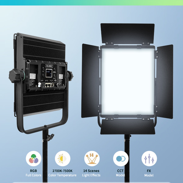 RGB led video light GL-600C with 360 full RGB colors and 14 pre set effects those will help you saving much time of programming.High CRI95 both for 2700-7500K bi color light or RGB colored light. Two powered ways AC or DC v mount battery power supply good for indoor or outdoor shootings. it comes with an external power supply, remote, power cord. And we suggest you to add on a wift controller which is able to use wireless DMX system.